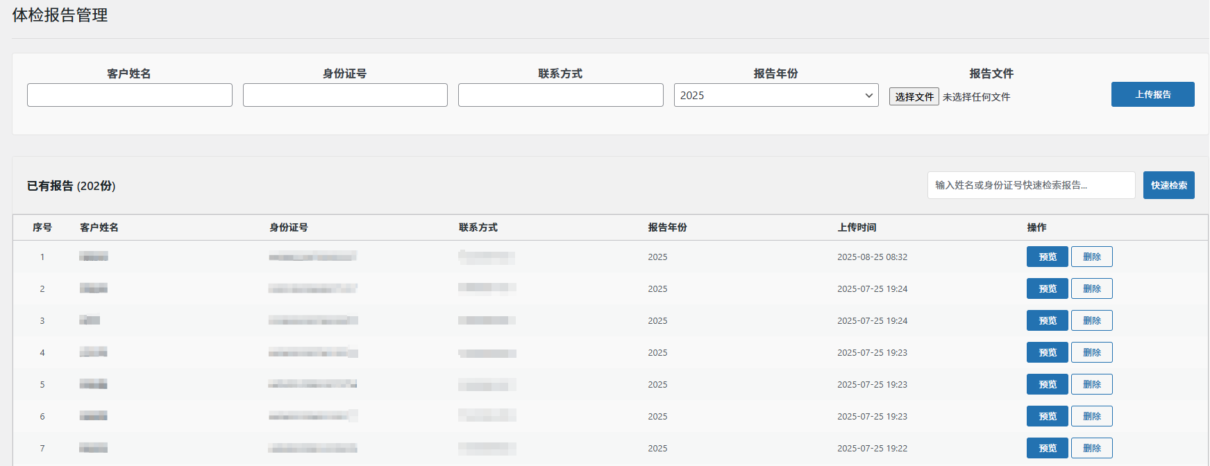 这款插件的核心在于其简洁而强大的功能设计。系统采用三重身份验证机制,确保只有授权用户才能访问相关报告,有效保护了个人隐私和数据安全。客户只需在前端页面输入姓名、身份证号和手机号,即可快速查询到自己的体检报告。后台管理系统提供了直观的操作界面,支持批量上传多种格式的文件,包括PDF、Word、Excel等常见格式。管理员可以轻松查看所有报告的上传记录,并进行快速检索。系统还提供了详细的统计功能,帮助机构更好地了解业务情况。特别值得一提的是插件的预览功能。用户无需下载文件即可直接在线预览报告内容,这大大提升了使用体验。同时,系统还提供了一键下载选项,满足用户保存报告的需求。